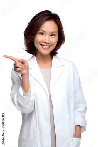 Woman in lab coat pointing to the left with a smile on a white background in a studio shot