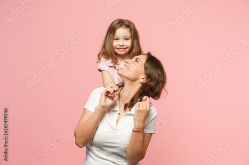 Woman in light clothes have fun with cute child baby girl. Mother, little kid daughter isolated on pastel pink wall background, studio portrait. Mother's Day, love family, parenthood childhood concept