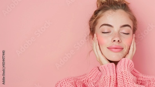 Woman in Pink Sweater, Blonde Hair in Bun, Soft Pink Background, Dewy Skin, Relaxed Expression, Minimalist Style, Natural Makeup, Warm Glow, Serene Look, Copyspace for Text