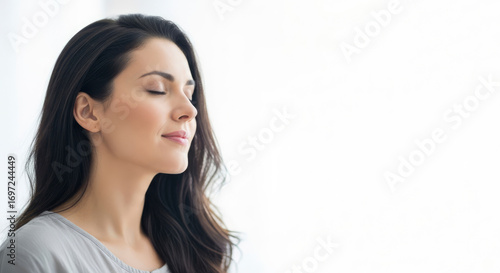 Woman in profile eyes closed dark hair wearing a gray top against a bright white background