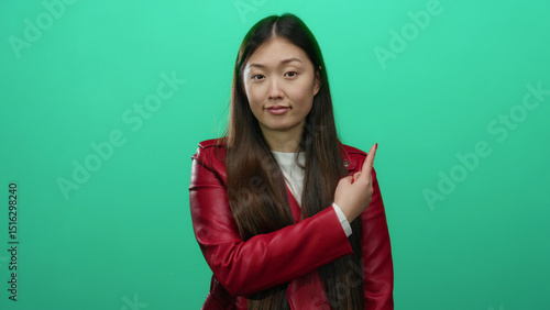 Woman in red jacket pointing over green background showing emotion gesture thoughtful stylish adult attractive female isolated.