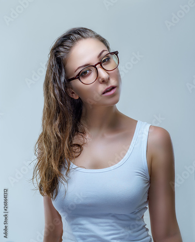 Woman in stylish glasses and white shirt is looking at the camera isolated on gray background in a studio close up. Fashion accessories photography with slim and sexy female model