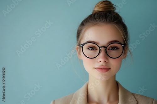 Woman in suit and glasses with light blue background, beautiful young girl with cute face