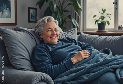 Woman in sweatshirt relaxing on a couch with a cozy blanket