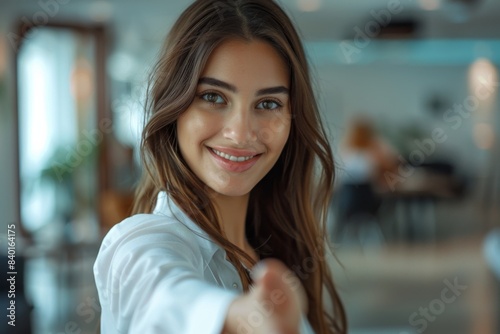 Woman in white shirt smiling, holding white remote control