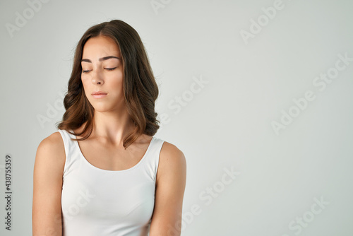 woman in white t shirt emotion displeased facial expression studio isolated background