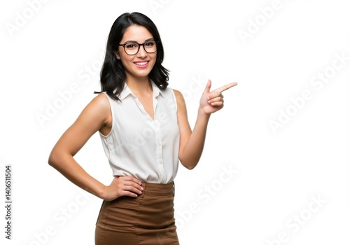 Woman in white top and brown skirt pointing to the right with a smile on a white background