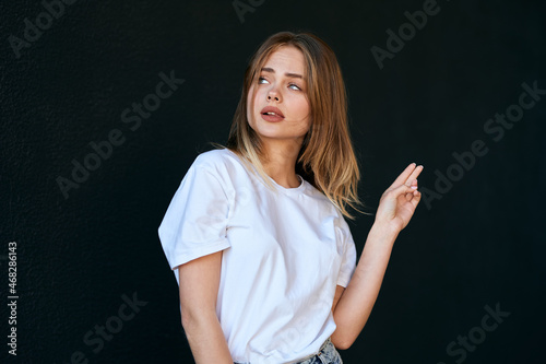 woman in white t-shirt on dark background fun posing fashion