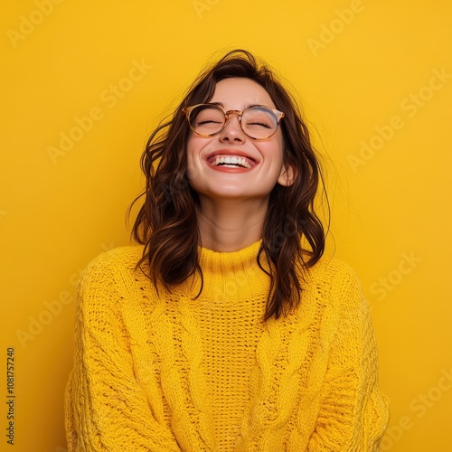 Woman in Yellow Sweater and Glasses Laughs Joyfully