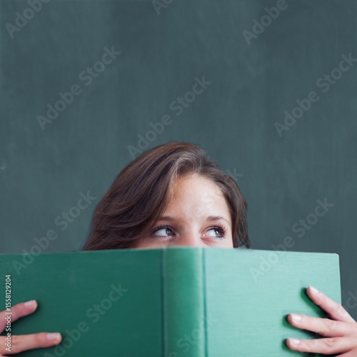 woman is holding green hardcover book while gazing right at dark green chalkboard in flat design