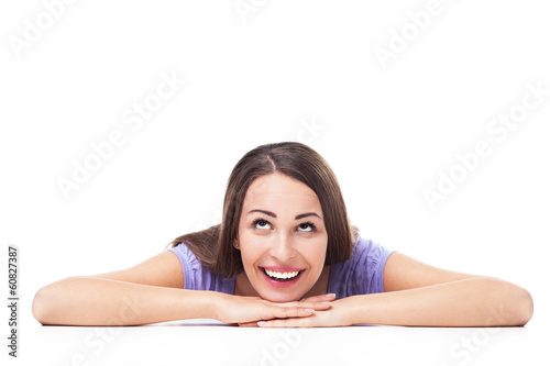 Woman leaning on table, looking up