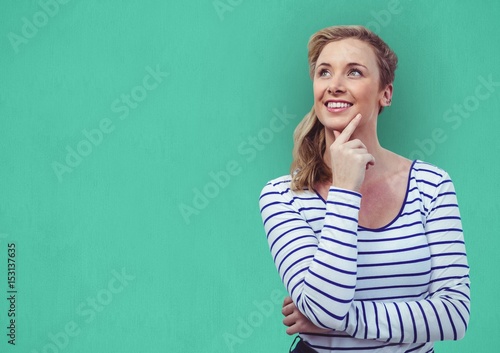 Woman looking away over green background