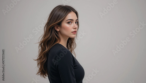 Woman Looking Over Shoulder with Long Wavy Hair and Black Shirt
