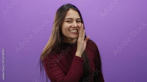 Woman making a secret gesture in front of a purple background showcasing a joyful expression with long hair.