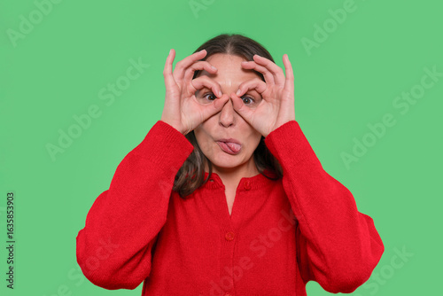 Woman making a silly face with hands shaped like glasses against a bright green background in a playful indoor setting