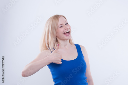 Woman making thumbs up gesture on white isolated background. Woman making sign ok, good with her hand. Beautiful blonde girl in blue shirt smiling and beaming.