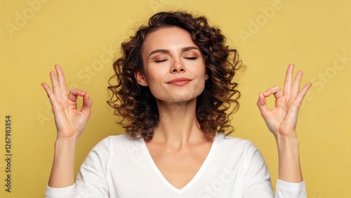 Woman meditating with peaceful expression, hands in OK gesture against yellow background