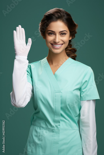 Woman nurse smiling with one hand in the air, volunteer or high five gesture