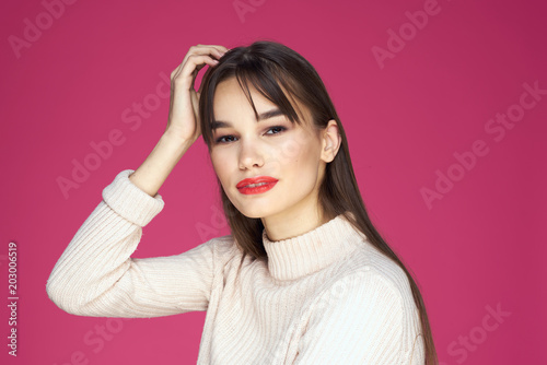 woman on bright background pink makeup