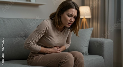 Woman on Sofa Gripping Stomach in Pain, Looking Down with Concer