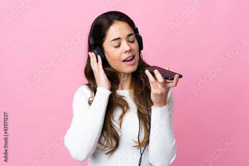 Woman over isolated pink background listening music with a mobile and singing