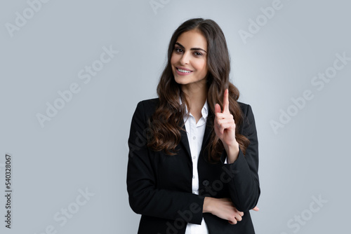Woman point at copy space, showing copyspace pointing. Promo, girl showing advertisement content gesture, pointing with hand recommend product. Isolated background.