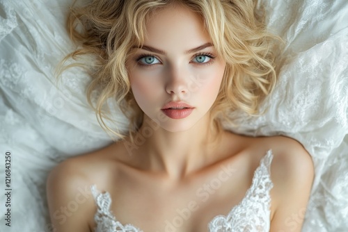 Woman poses elegantly on white fabric with soft, wavy hair and captivating blue eyes in a serene setting