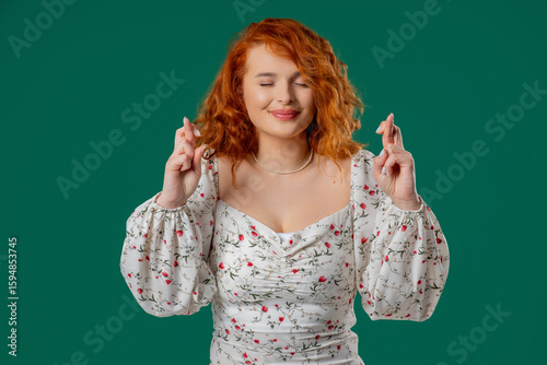Woman praying with crossed fingers, green background. Lady begs someone, satisfy desires, help with, prays for luck.