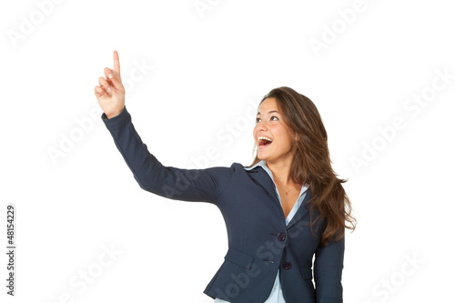 woman presenting your very exciting product. Isolated on white.