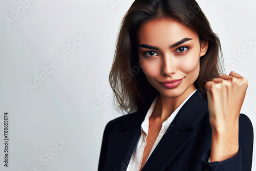 woman professional exemplifies a winning attitude through her clenched fist gesture isolated on white background