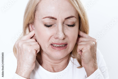 Woman put her fingers in her hands and feels pain.