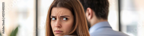 Woman reacting with concern in an office environment