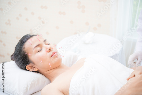Woman receiving facial acupuncture treatment