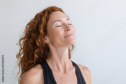 Woman red hair closed eyes relaxation wellness calm peaceful serene portrait adult female curly hair natural light healthy lifestyle mindfulness meditation breathing exercise content indoor casual