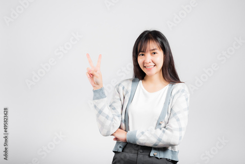 Woman showing finger making v-sign victory symbol side away looking to camera, Happy Asian beautiful young female mark peace gesture symbol, studio shot isolated on white background with copy space