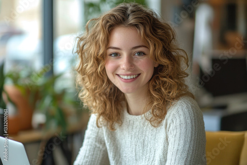 Woman sitting at table with laptop, focused on screen. Bright window light illuminates cozy home office setting. Symbolizes productivity and concentration.