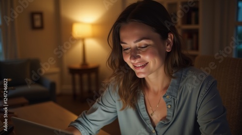 Woman sitting at table working on laptop in cozy, warmly lit home interior