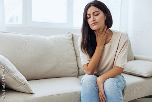 Woman sitting on sofa at home pain in nose and throat, cold and allergy, covid-19 disease, temperature