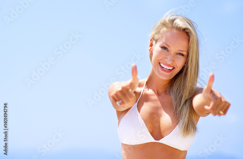 Woman, smile and bikini at beach to point at you, excited and choice on tropical holiday by sky background. Girl, portrait and mock up space with swimwear, vacation and summer with fashion in Miami