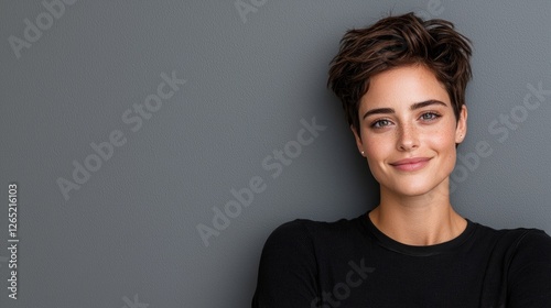 Woman smiling against gray background