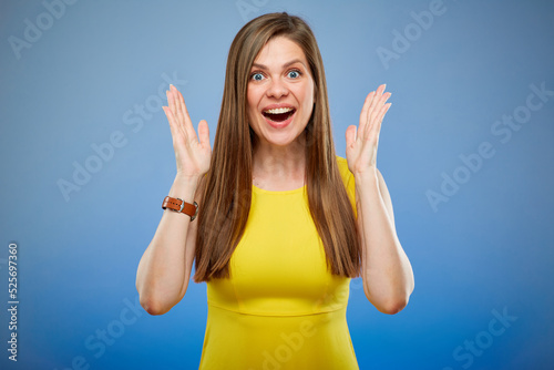 Woman smiling and surprising. Isolated female portrait on blue background.