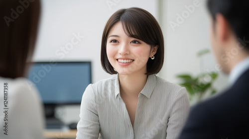 オフィスで笑顔で話す女性,説明,働く女性,打ち合わせ,コミュニケーション,ビジネスシーン,ポートレート,同僚との会話,ビジネスプレゼンテーション,オフィス風景,Woman smiling and talking in the office,Meeting, Communication, Business scene, Working woman ,Generative AI