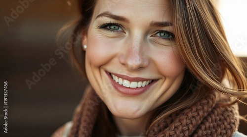 Woman smiling brightly in soft natural light outdoors. mother, smiling,