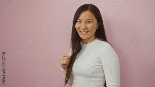 Woman smiling isolated against a pink background depicting youthful style and cheerful demeanor with emphasis on beauty and elegance.