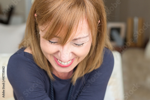 Woman smiling looking down.