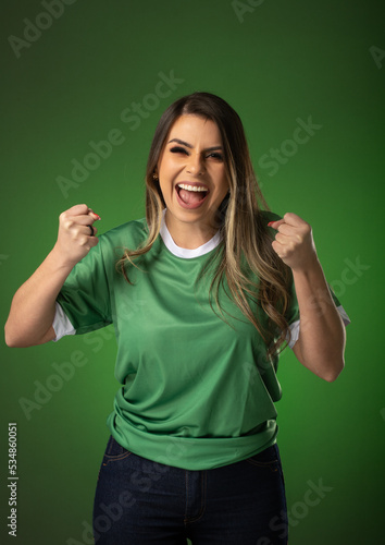 woman soccer fan cheering for her favorite club and team. world cup green background