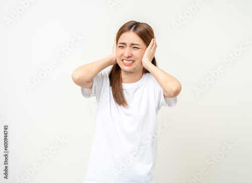 Woman stressed and frustrated covering her ears with her hands due to loud noise. Annoyed noise sound pollution. Asian Woman blocking ears