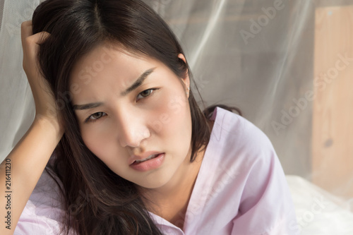 woman suffering from headache; portrait of tired, depressed, sleepless woman suffering from insomnia, hangover, headache; 20s young adult asian woman model