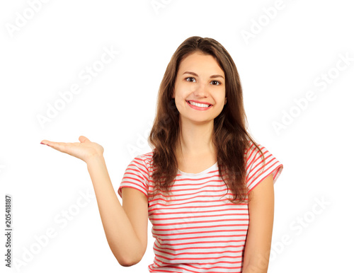 Woman surprise showing product. Presenting your product. emotional girl isolated on white background