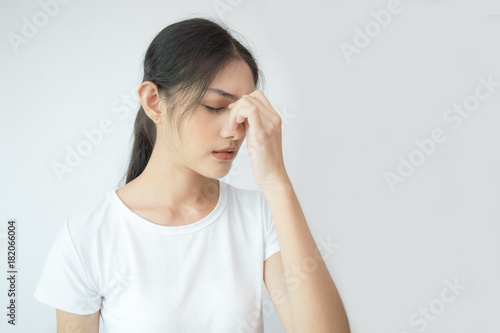Woman touching her head with hands. Young asian woman feel headache. Isolated on white background.